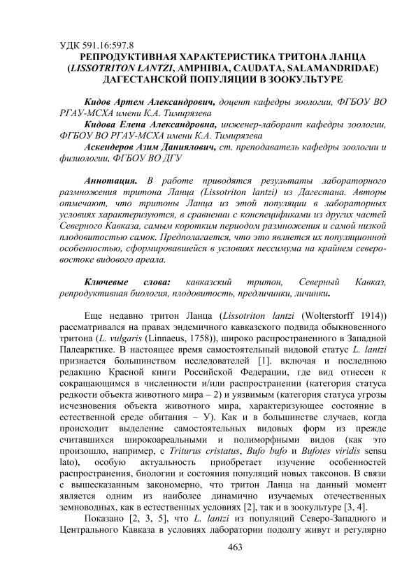 Кидов, А. А. РЕПРОДУКТИВНАЯ ХАРАКТЕРИСТИКА ТРИТОНА ЛАНЦА (LISSOTRITON LANTZI, AMPHIBIA, CAUDATA, SALAMANDRIDAE) ДАГЕСТАНСКОЙ ПОПУЛЯЦИИ В ЗООКУЛЬТУРЕ: доклад, тезисы доклада / А. А. Кидов, Е. А. Кидова , А. Д. Аскендеров; Университет - МСХА имени К. А. Тимирязева (Москва). — С.459-462. — Электрон. текстовые дан. // СБОРНИК СТАТЕЙ по материалам докладов ученых РГАУ -МСХА имени К.А. Тимирязева, других вузов и научно - исследовательских учреждений на Международной научной конференции профессорско- преподавательского состава, посвященной 155-летию РГАУ - МСХА имени К.А. Тимирязева, которая проходила 2-4 декабря 2020 года. Выпуск 293 ч.1. – Москва, 2020. — Коллекция: Конференции РГАУ - МСХА им. К. А. Тимирязева. — Коллекция: Доклады ТСХА. — Свободный доступ из сети Интернет (чтение, печать, копирование). — Режим доступа : http://elib.timacad.ru/dl/full/doctsha-293-1-2021-143.pdf. - Загл. с титул. экрана. - Электрон. версия печ. публикации. — <URL:http://elib.timacad.ru/dl/full/doctsha-293-1-2021-143.pdf>.