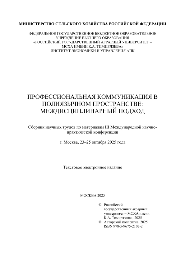 Профессиональная коммуникация в полиязычном пространстве: междисциплинарный подход: РГАУ-МСХА имени К.А. Тимирязева / ред.: А.А. Зайцев [и др.]; рец.: А.В. Малёв, Н.И. Еремкина. — Электрон. текстовые дан. — Москва, 23–25 октября 2025 г., 2025. — 533 с. — Коллекция: Конференции РГАУ - МСХА им. К. А. Тимирязева. — Свободный доступ из сети Интернет (чтение, печать, копирование). — Режим доступа : http://elib.timacad.ru/dl/full/s05122025PKPP_MP.pdf. - Загл. с титул. экрана. - Электрон. версия печ. публикации. — <URL:http://elib.timacad.ru/dl/full/s05122025PKPP_MP.pdf>.