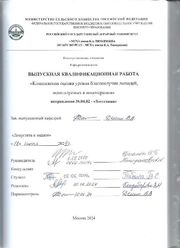 Табола, Т. С. Комплексная оценка уровня благополучия лошадей, используемых в иппотерапии: защищена ..2024 / Т. С. Табола; рук. работы: И. Б. Цыганок, А. А. Ксенофонтова; Российский государственный аграрный университет - МСХА имени К. А. Тимирязева [и др.]. — Электрон. текстовые дан. — Москва, 2024. — 87 с. — Коллекция: Выпускные квалификационные работы. — Доступ по паролю из сети Интернет (чтение, печать, копирование). — Режим доступа : http://elib.timacad.ru/dl/local/vkr-k12207.pdf. - Загл. с титул. экрана. - Электрон. версия печ. публикации. — <URL:http://elib.timacad.ru/dl/local/vkr-k12207.pdf>.