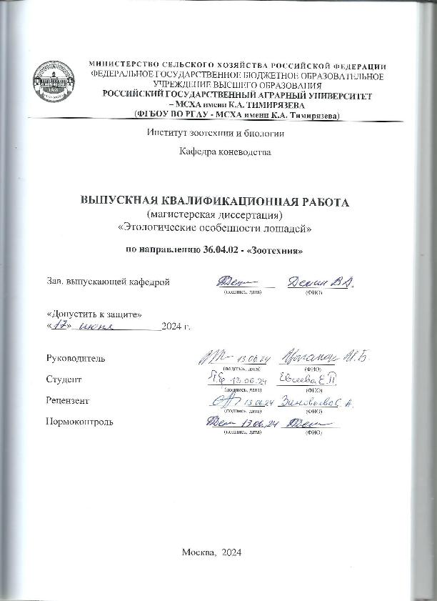 Евсеева, Е. П. Этологические особенности лошадей: защищена ..2024 / Е. П. Евсеева; рук. работы И. Б. Цыганок; Российский государственный аграрный университет - МСХА имени К. А. Тимирязева [и др.]. — Электрон. текстовые дан. — Москва, 2024. — 53 с. — Коллекция: Выпускные квалификационные работы. — Доступ по паролю из сети Интернет (чтение, печать, копирование). — Режим доступа : http://elib.timacad.ru/dl/local/vkr-k12209.pdf. - Загл. с титул. экрана. - Электрон. версия печ. публикации. — <URL:http://elib.timacad.ru/dl/local/vkr-k12209.pdf>.