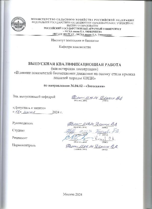 Пруткова, Т. В. Влияние показателей биомеханики движения на оценку стиля прыжка лошадей породы КВПН: защищена ..2024 / Т. В. Пруткова; рук. работы В. А. Демин; Российский государственный аграрный университет - МСХА имени К. А. Тимирязева [и др.]. — Электрон. текстовые дан. — Москва, 2024. — 85 с. — Коллекция: Выпускные квалификационные работы. — Доступ по паролю из сети Интернет (чтение, печать, копирование). — Режим доступа : http://elib.timacad.ru/dl/local/vkr-k12211.pdf. - Загл. с титул. экрана. - Электрон. версия печ. публикации. — <URL:http://elib.timacad.ru/dl/local/vkr-k12211.pdf>.