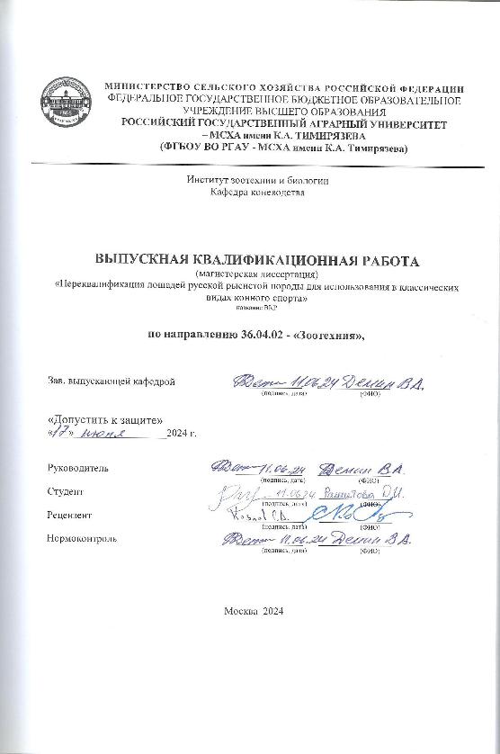 Рашитова, Д. И. Переквалификация лошадей русской рысистой породы для использования в классических видах конного спорта: защищена ..2024 / Д. И. Рашитова; рук. работы В. А. Демин; Российский государственный аграрный университет - МСХА имени К. А. Тимирязева [и др.]. — Электрон. текстовые дан. — Москва, 2024. — 75 с. — Коллекция: Выпускные квалификационные работы. — Доступ по паролю из сети Интернет (чтение, печать, копирование). — Режим доступа : http://elib.timacad.ru/dl/local/vkr-k12212.pdf. - Загл. с титул. экрана. - Электрон. версия печ. публикации. — <URL:http://elib.timacad.ru/dl/local/vkr-k12212.pdf>.