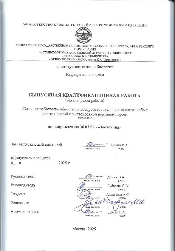 Алексеева, А. С. Влияние работоспособности на воспроизводительные качества кобыл ахалтекинской и чистокровной верховой пород: защищена ..2025 / А. С. Алексеева; рук. работы: В. А. Демин, С. В. Губарева; Российский государственный аграрный университет - МСХА имени К. А. Тимирязева [и др.]. — Электрон. текстовые дан. — Москва, 2025. — 52 с. — Коллекция: Выпускные квалификационные работы. — Доступ по паролю из сети Интернет (чтение, печать, копирование). — Режим доступа : http://elib.timacad.ru/dl/local/vkr-k12213.pdf. - Загл. с титул. экрана. - Электрон. версия печ. публикации. — <URL:http://elib.timacad.ru/dl/local/vkr-k12213.pdf>.