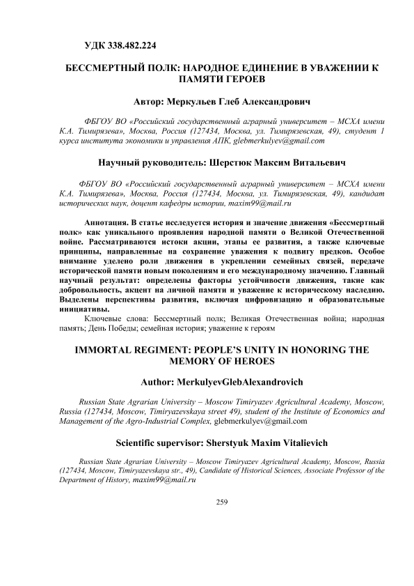 Меркульев, Глеб Александрович. БЕССМЕРТНЫЙ ПОЛК: НАРОДНОЕ ЕДИНЕНИЕ В УВАЖЕНИИ К ПАМЯТИ ГЕРОЕВ: РАЗДЕЛ 2. АКТУАЛЬНЫЕ ВОПРОСЫ ОТЕЧЕСТВЕННОЙ ИСТОРИИ / П. И. Ясинская; науч. рук. А. С. Позднякова. — с.259-264. — Электрон. текстовые дан. // ЛАБИРИНТЫ ВРЕМЕНИ: ИСТОРИЯ, ИСТОЧНИКИ, ИСТОРИОГРАФИЯ. Сборник статей участников Всероссийской (национальной) научной конференции студентов и аспирантов. – 2025. – Коллекция: Конференции РГАУ - МСХА им. К. А. Тимирязева. — Свободный доступ из сети Интернет (чтение, печать, копирование). — Режим доступа : http://elib.timacad.ru/dl/full/LV-2-18.pdf. - Загл. с титул. экрана. — <URL:http://elib.timacad.ru/dl/full/LV-2-18.pdf>.