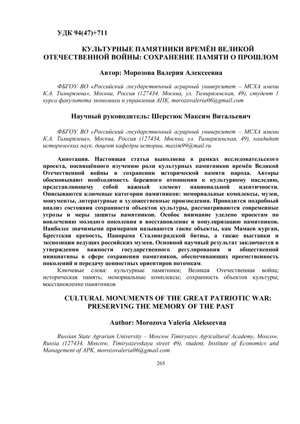 Морозова, Валерия Алексеевна. КУЛЬТУРНЫЕ ПАМЯТНИКИ ВРЕМЁН ВЕЛИКОЙ ОТЕЧЕСТВЕННОЙ ВОЙНЫ: СОХРАНЕНИЕ ПАМЯТИ О ПРОШЛОМ: РАЗДЕЛ 2. АКТУАЛЬНЫЕ ВОПРОСЫ ОТЕЧЕСТВЕННОЙ ИСТОРИИ / В. А. Морозова; науч. рук. М. В. Шерстюк. — с.265-272. — Электрон. текстовые дан. // ЛАБИРИНТЫ ВРЕМЕНИ: ИСТОРИЯ, ИСТОЧНИКИ, ИСТОРИОГРАФИЯ. Сборник статей участников Всероссийской (национальной) научной конференции студентов и аспирантов. – 2025. – Коллекция: Конференции РГАУ - МСХА им. К. А. Тимирязева. — Свободный доступ из сети Интернет (чтение, печать, копирование). — Режим доступа : http://elib.timacad.ru/dl/full/LV-2-19.pdf. - Загл. с титул. экрана. — <URL:http://elib.timacad.ru/dl/full/LV-2-19.pdf>.