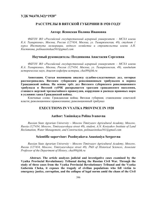 Ясинская, Полина Ивановна. РАССТРЕЛЫ В ВЯТСКОЙ ГУБЕРНИИ В 1920 ГОДУ: РАЗДЕЛ 2. АКТУАЛЬНЫЕ ВОПРОСЫ ОТЕЧЕСТВЕННОЙ ИСТОРИИ / П. И. Ясинская; науч. рук. А. С. Позднякова. — с.396-401. — Электрон. текстовые дан. // ЛАБИРИНТЫ ВРЕМЕНИ: ИСТОРИЯ, ИСТОЧНИКИ, ИСТОРИОГРАФИЯ. Сборник статей участников Всероссийской (национальной) научной конференции студентов и аспирантов. – 2025. – Коллекция: Конференции РГАУ - МСХА им. К. А. Тимирязева. — Свободный доступ из сети Интернет (чтение, печать, копирование). — Режим доступа : http://elib.timacad.ru/dl/full/LV-2-38.pdf. - Загл. с титул. экрана. — <URL:http://elib.timacad.ru/dl/full/LV-2-38.pdf>.
