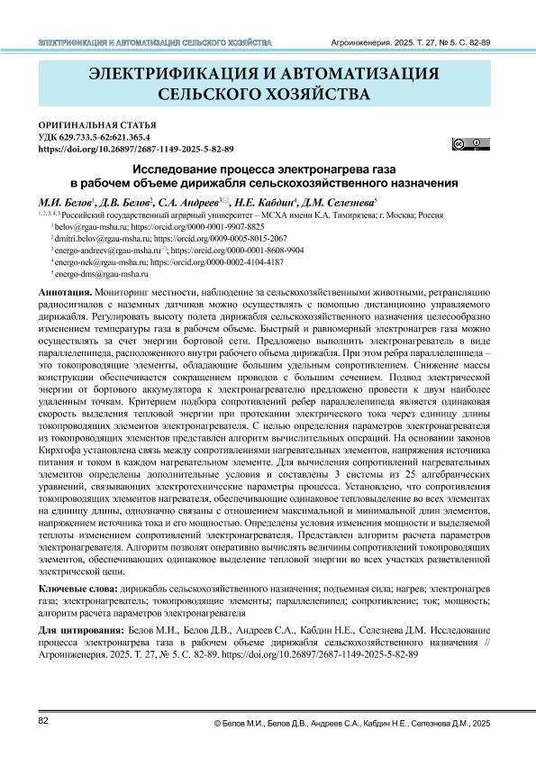 Исследование процесса электронагрева газа в рабочем объеме дирижабля сельскохозяйственного назначения = Electrical heating of gas in the working volume of agricultural airships / М. И. Белов, Д. В. Белов, С. А. АНДРЕЕВ [и др.]. — с.82-89. — Электрон. текстовые дан. // АГРОИНЖЕНЕРИЯ. – 2025. – Том 27, №.5. — Коллекция: Журнал «Агроинженерия». — Свободный доступ из сети Интернет (чтение, печать, копирование). — http://elib.timacad.ru/dl/full/vmgau-11-2025-5.pdf. - Загл. с титул. экрана. - https://doi.org/10.26897/2687-1149-2025-5-82-89. — <URL:http://elib.timacad.ru/dl/full/vmgau-11-2025-5.pdf>. — <URL:https://doi.org/10.26897/2687-1149-2025-5-82-89>.