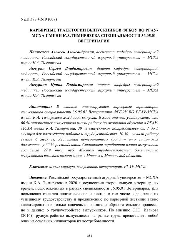 Пантелеев, А.А. КАРЬЕРНЫЕ ТРАЕКТОРИИ ВЫПУСКНИКОВ ФГБОУ ВО РГАУ-МСХА ИМЕНИ К.А.ТИМИРЯЗЕВА СПЕЦИАЛЬНОСТИ 36.05.01 ВЕТЕРИНАРИЯ = CAREER TRAJECTORIES OF GRADUATES OF THE SPECIALTY 36.05.01 VETERINARY, RUSSIAN STATE AGRARIAN UNIVERSITY -MOSCOW TIMIRYAZEV AGRICULTURAL ACADEMY: СБОРНИК СТАТЕЙ ВСЕРОССИЙСКОЙ (НАЦИОНАЛЬНОЙ) НАУЧНО-ПРАКТИЧЕСКОЙ КОНФЕРЕНЦИИ «АКТУАЛЬНЫЕ ВОПРОСЫ ВЕТЕРИНАРНОЙ МЕДИЦИНЫ: ОБРАЗОВАНИЕ, НАУКА, ПРАКТИКА» / А. А. Пантелеев, С.В.  Акчурин, И. В. Акчурина; Российский государственный аграрный университет - МСХА имени К. А. Тимирязева (Москва). — Электрон. текстовые дан. // Коллекция: Конференции РГАУ - МСХА им. К. А. Тимирязева. — Свободный доступ из сети Интернет (чтение, печать, копирование). — Режим доступа : http://elib.timacad.ru/dl/full/sb-vnpk-2021-68.pdf. - Загл. с титул. экрана. - Электрон. версия печ. публикации. - https://doi.org/10.26897/978-5-9675-1853-9-2021-68. — <URL:http://elib.timacad.ru/dl/full/sb-vnpk-2021-68.pdf>. — <URL:https://doi.org/10.26897/978-5-9675-1853-9-2021-68>.  | 1/14/2022 |