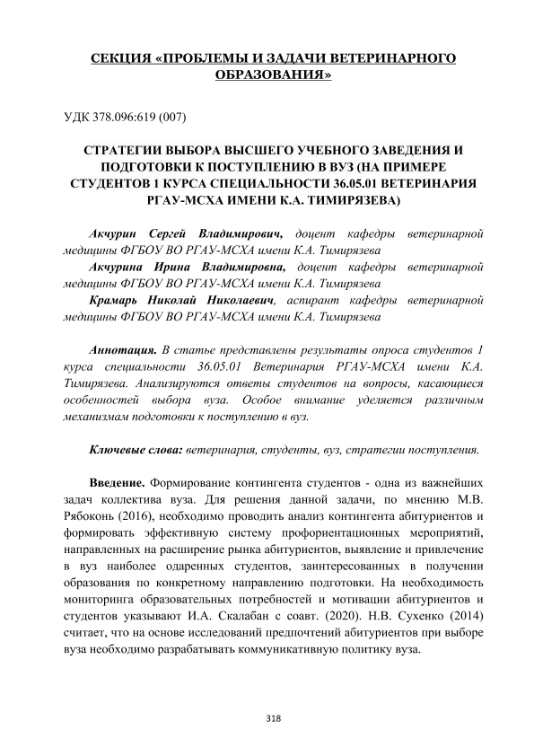 Акчурин, С. В. СТРАТЕГИИ ВЫБОРА ВЫСШЕГО УЧЕБНОГО ЗАВЕДЕНИЯ И ПОДГОТОВКИ К ПОСТУПЛЕНИЮ В ВУЗ (НА ПРИМЕРЕ СТУДЕНТОВ 1 КУРСА СПЕЦИАЛЬНОСТИ 36.05.01 ВЕТЕРИНАРИЯ РГАУ-МСХА ИМЕНИ К.А. ТИМИРЯЗЕВА) = STRATEGIES FOR SELECTING A HIGHER EDUCATIONAL INSTITUTION AND PREPARATION FOR ENTRY IN AN ACADEMY (ON THE EXAMPLE OF STUDENTS OF THE 1st COURSE OF SPECIALTIES 36.05.01 VETERINARY RSAU-MTAA): СБОРНИК СТАТЕЙ ВСЕРОССИЙСКОЙ (НАЦИОНАЛЬНОЙ) НАУЧНО-ПРАКТИЧЕСКОЙ КОНФЕРЕНЦИИ «АКТУАЛЬНЫЕ ВОПРОСЫ ВЕТЕРИНАРНОЙ МЕДИЦИНЫ: ОБРАЗОВАНИЕ, НАУКА, ПРАКТИКА» / С. В. Акчурин , И. В. Акчурина , Н. Н. Крамарь; Российский государственный аграрный университет - МСХА имени К. А. Тимирязева (Москва). — Электрон. текстовые дан. // Коллекция: Конференции РГАУ - МСХА им. К. А. Тимирязева. — Свободный доступ из сети Интернет (чтение, печать, копирование). — Режим доступа : http://elib.timacad.ru/dl/full/sb-vnpk-2021-62.pdf. - Загл. с титул. экрана. - Электрон. версия печ. публикации. - https://doi.org/10.26897/978-5-9675-1853-9-2021-62. — <URL:http://elib.timacad.ru/dl/full/sb-vnpk-2021-62.pdf>. — <URL:https://doi.org/10.26897/978-5-9675-1853-9-2021-62>.  | 1/13/2022 |