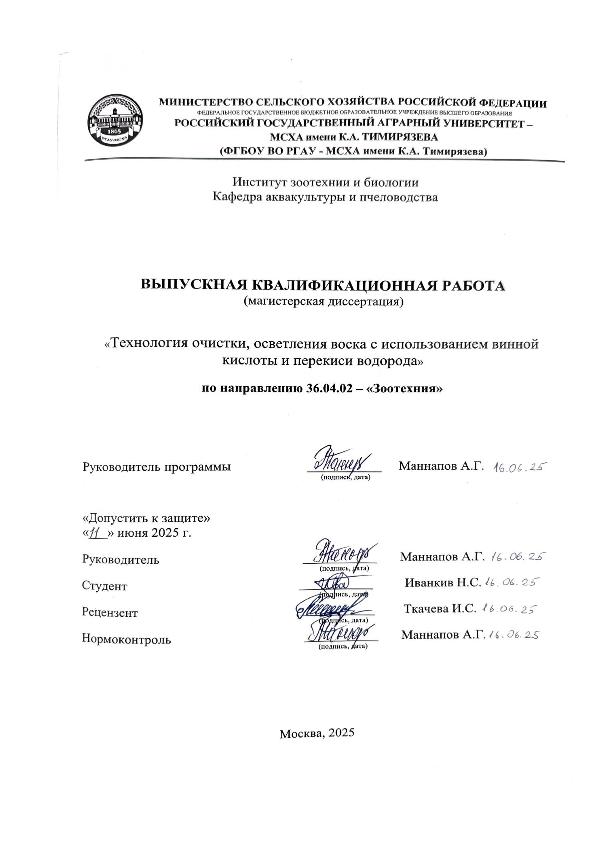 Иванкив, Н. С. Технология очистки, осветления воска с использованием винной кислоты и перекиси водорода: защищена ..2025 / Н. С. Иванкив; рук. работы А. Г. Маннапов; Российский государственный аграрный университет - МСХА имени К. А. Тимирязева [и др.]. — Электрон. текстовые дан. — Москва, 2025. — 86 с. — Коллекция: Выпускные квалификационные работы. — Доступ по паролю из сети Интернет (чтение, печать, копирование). — Режим доступа : http://elib.timacad.ru/dl/local/vkr-k11844.pdf. - Загл. с титул. экрана. - Электрон. версия печ. публикации. — <URL:http://elib.timacad.ru/dl/local/vkr-k11844.pdf>.
