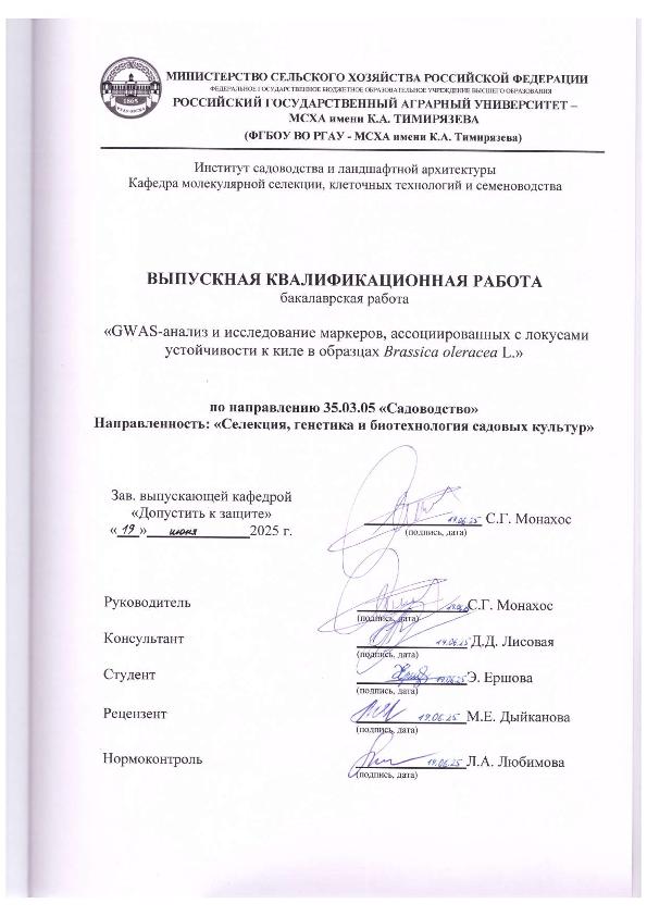 Ершова, Э. GWAS-анализ и исследование маркеров, ассоциированных с локусами устойчивости к киле в образцах Brassica oleracea L.: защищена ..2025 / Э. Ершова; рук. работы С. Г. Монахос; Российский государственный аграрный университет - МСХА имени К. А. Тимирязева [и др.]. — Электрон. текстовые дан. — Москва, 2025. — 68 с. — Коллекция: Выпускные квалификационные работы. — Доступ по паролю из сети Интернет (чтение, печать, копирование). — Режим доступа : http://elib.timacad.ru/dl/local/vkr-k11851.pdf. - Загл. с титул. экрана. - Электрон. версия печ. публикации. — <URL:http://elib.timacad.ru/dl/local/vkr-k11851.pdf>.