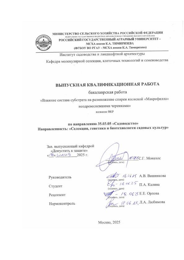 Калина, П. А. Влияние состава субстрата на размножение спиреи японской "Макрофилла" неодревесневшими черенками: защищена ..2025 / П. А. Калина; рук. работы А. В. Вишнякова; Российский государственный аграрный университет - МСХА имени К. А. Тимирязева [и др.]. — Электрон. текстовые дан. — Москва, 2025. — 61 с. — Коллекция: Выпускные квалификационные работы. — Доступ по паролю из сети Интернет (чтение, печать, копирование). — Режим доступа : http://elib.timacad.ru/dl/local/vkr-k11854.pdf. - Загл. с титул. экрана. - Электрон. версия печ. публикации. — <URL:http://elib.timacad.ru/dl/local/vkr-k11854.pdf>.