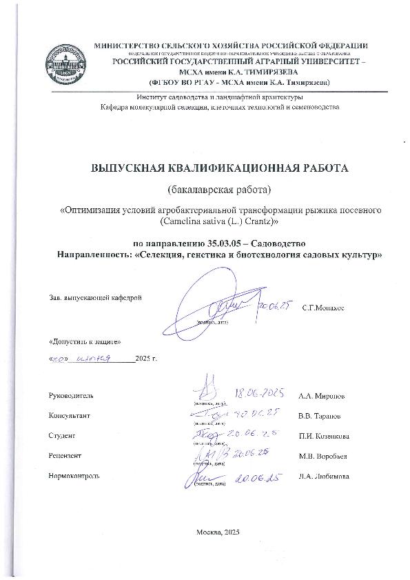 Козенкова, П. И. Оптимизация условий агробактериальной трансформации рыжика посевного (Camelina sativa (L.) Crantz): защищена ..2025 / П. И. Козенкова; рук. работы А. А. Миронов; Российский государственный аграрный университет - МСХА имени К. А. Тимирязева [и др.]. — Электрон. текстовые дан. — Москва, 2025. — 41 с. — Коллекция: Выпускные квалификационные работы. — Доступ по паролю из сети Интернет (чтение, печать, копирование). — Режим доступа : http://elib.timacad.ru/dl/local/vkr-k11856.pdf. - Загл. с титул. экрана. - Электрон. версия печ. публикации. — <URL:http://elib.timacad.ru/dl/local/vkr-k11856.pdf>.