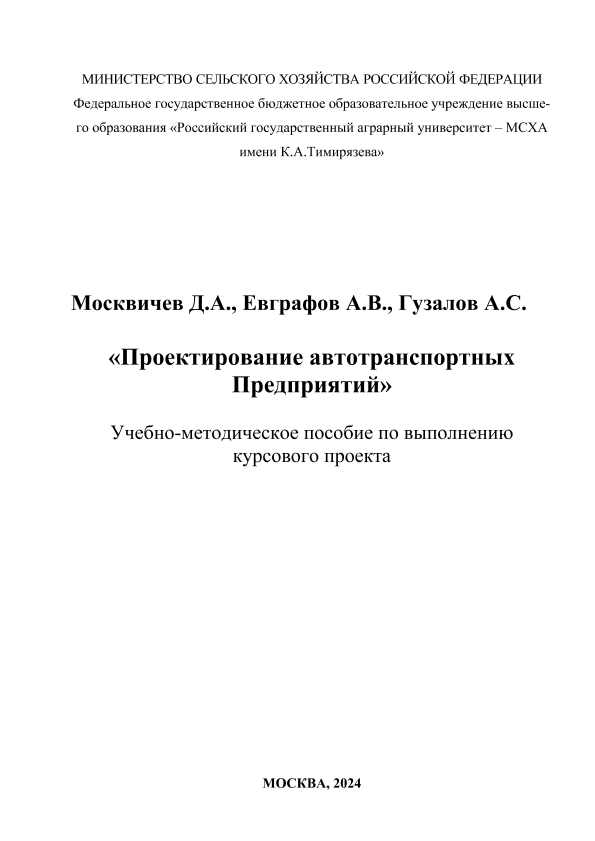 Москвичев, Д.А. Проектирование автотранспортных Предприятий: Учебно-методическое пособие по выполнению курсового проекта / Российский государственный аграрный университет - МСХА имени К. А. Тимирязева (Москва). — Электрон. текстовые дан. — Москва, 2024. — 70 с. — Коллекция: Учебная и учебно-методическая литература. — Доступ по паролю из сети Интернет (чтение, печать). — Режим доступа : http://elib.timacad.ru/dl/full/s22092025Moskvichiov.pdf. - Загл. с титул. экрана. - Электрон. версия печ. публикации. — <URL:http://elib.timacad.ru/dl/full/s22092025Moskvichiov.pdf>.