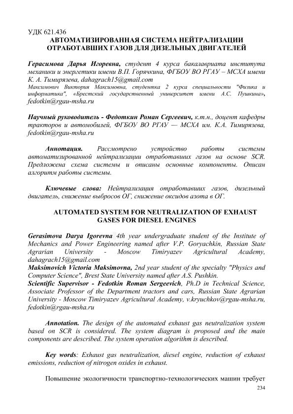 Герасимова, Дарья Игоревна. АВТОМАТИЗИРОВАННАЯ СИСТЕМА НЕЙТРАЛИЗАЦИИ ОТРАБОТАВШИХ ГАЗОВ ДЛЯ ДИЗЕЛЬНЫХ ДВИГАТЕЛЕЙ = AUTOMATED SYSTEM FOR NEUTRALIZATION OF EXHAUST GASES FOR DIESEL ENGINES: СЕКЦИЯ «ЦИФРОВЫЕ ТЕХНОЛОГИИ В АГРОИНЖЕНЕРИИ» / Д. И. Герасимова , В. М. Максимович; науч.рук. Р. С. Федоткин. — с.234-240. — Электрон. текстовые дан. // СБОРНИК СТАТЕЙ по материалам Научного форума: Экономика, управление и цифровые технологии в АПК-2024. Том 4. – 2024. – Коллекция: Конференции РГАУ - МСХА им. К. А. Тимирязева. — Свободный доступ из сети Интернет (чтение, печать, копирование). — Режим доступа : http://elib.timacad.ru/dl/full/sb170325-t1-4-51.pdf. - Загл. с титул. экрана. — <URL:http://elib.timacad.ru/dl/full/sb170325-t1-4-51.pdf>.
