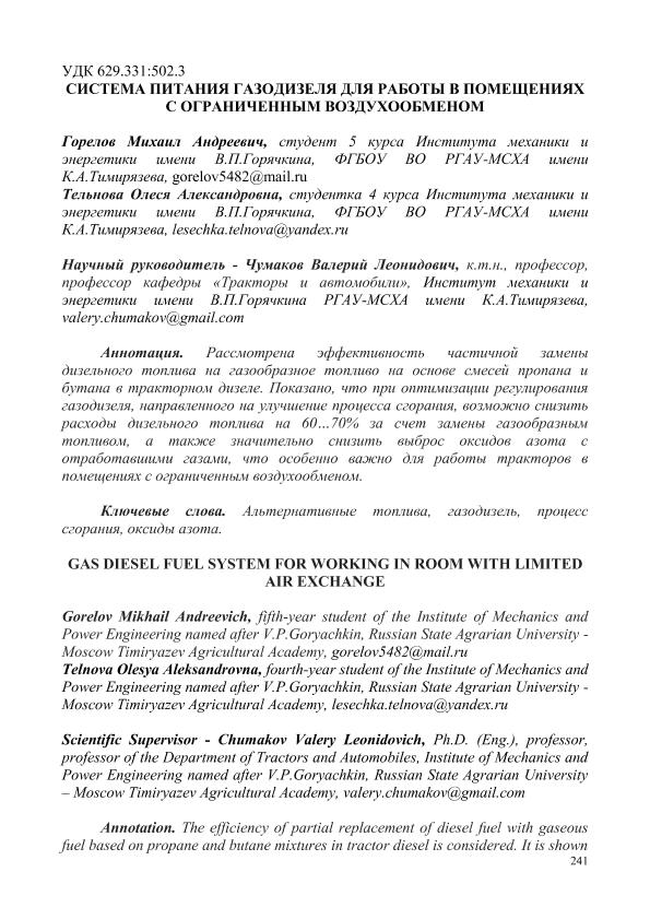 Горелов, Михаил Андреевич. СИСТЕМА ПИТАНИЯ ГАЗОДИЗЕЛЯ ДЛЯ РАБОТЫ В ПОМЕЩЕНИЯХ С ОГРАНИЧЕННЫМ ВОЗДУХООБМЕНОМ = GAS DIESEL FUEL SYSTEM FOR WORKING IN ROOM WITH LIMITED AIR EXCHANGE: СЕКЦИЯ «ЦИФРОВЫЕ ТЕХНОЛОГИИ В АГРОИНЖЕНЕРИИ» / М. А. Горелов , В. М. Максимович; науч.рук. Р. С. Федоткин. — с.241-245. — Электрон. текстовые дан. // СБОРНИК СТАТЕЙ по материалам Научного форума: Экономика, управление и цифровые технологии в АПК-2024. Том 4. – 2024. – Коллекция: Конференции РГАУ - МСХА им. К. А. Тимирязева. — Свободный доступ из сети Интернет (чтение, печать, копирование). — Режим доступа : http://elib.timacad.ru/dl/full/sb170325-t1-4-52.pdf. - Загл. с титул. экрана. — <URL:http://elib.timacad.ru/dl/full/sb170325-t1-4-52.pdf>.