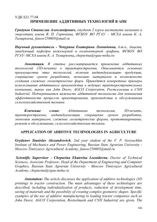 Грядунов, Станислав Александрович. ПРИМЕНЕНИЕ АДДИТИВНЫХ ТЕХНОЛОГИЙ В АПК = APPLICATION OF ADDITIVE TECHNOLOGIES IN AGRICULTURE: СЕКЦИЯ «ЦИФРОВЫЕ ТЕХНОЛОГИИ В АГРОИНЖЕНЕРИИ» / С. А. Грядунов; науч.рук. Е. Л. Чепурина. — с.246-250. — Электрон. текстовые дан. // СБОРНИК СТАТЕЙ по материалам Научного форума: Экономика, управление и цифровые технологии в АПК-2024. Том 4. – 2024. – Коллекция: Конференции РГАУ - МСХА им. К. А. Тимирязева. — Свободный доступ из сети Интернет (чтение, печать, копирование). — Режим доступа : http://elib.timacad.ru/dl/full/sb170325-t1-4-53.pdf. - Загл. с титул. экрана. — <URL:http://elib.timacad.ru/dl/full/sb170325-t1-4-53.pdf>.