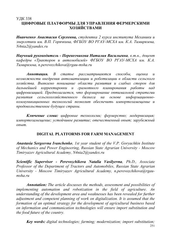 Иванченко, Анастасия Сергеевна. ЦИФРОВЫЕ ПЛАТФОРМЫ ДЛЯ УПРАВЛЕНИЯ ФЕРМЕРСКИМИ ЦИФРОВЫЕ ПЛАТФОРМЫ ДЛЯ УПРАВЛЕНИЯ ФЕРМЕРСКИМИ = DIGITAL PLATFORMS FOR FARM MANAGEMENT: СЕКЦИЯ «ЦИФРОВЫЕ ТЕХНОЛОГИИ В АГРОИНЖЕНЕРИИ» / Anastasia SergeevnaС. А. Грядунов; науч.рук. Е. Л. Чепурина. — с.251-254. — Электрон. текстовые дан. // СБОРНИК СТАТЕЙ по материалам Научного форума: Экономика, управление и цифровые технологии в АПК-2024. Том 4. – 2024. – Коллекция: Конференции РГАУ - МСХА им. К. А. Тимирязева. — Свободный доступ из сети Интернет (чтение, печать, копирование). — Режим доступа : http://elib.timacad.ru/dl/full/sb170325-t1-4-54.pdf. - Загл. с титул. экрана. — <URL:http://elib.timacad.ru/dl/full/sb170325-t1-4-54.pdf>.