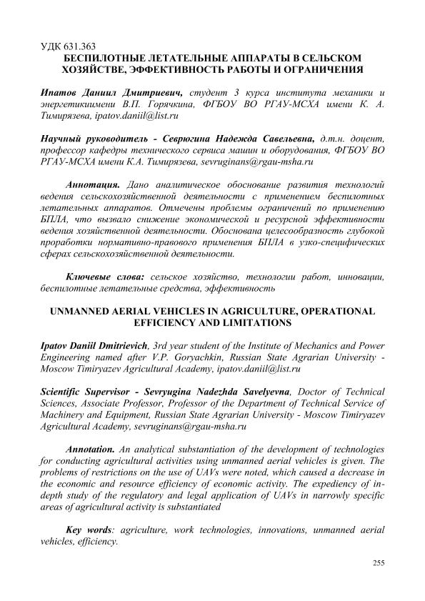 Ипатов, Даниил Дмитриевич. БЕСПИЛОТНЫЕ ЛЕТАТЕЛЬНЫЕ АППАРАТЫ В СЕЛЬСКОМ ХОЗЯЙСТВЕ, ЭФФЕКТИВНОСТЬ РАБОТЫ И ОГРАНИЧЕНИЯ = UNMANNED AERIAL VEHICLES IN AGRICULTURE, OPERATIONAL EFFICIENCY AND LIMITATIONS: СЕКЦИЯ «ЦИФРОВЫЕ ТЕХНОЛОГИИ В АГРОИНЖЕНЕРИИ» / Д. Д. Ипатов; науч.рук. Н. С. Севрюгина. — с.255-259. — Электрон. текстовые дан. // СБОРНИК СТАТЕЙ по материалам Научного форума: Экономика, управление и цифровые технологии в АПК-2024. Том 4. – 2024. – Коллекция: Конференции РГАУ - МСХА им. К. А. Тимирязева. — Свободный доступ из сети Интернет (чтение, печать, копирование). — Режим доступа : http://elib.timacad.ru/dl/full/sb170325-t1-4-55.pdf. - Загл. с титул. экрана. — <URL:http://elib.timacad.ru/dl/full/sb170325-t1-4-55.pdf>.