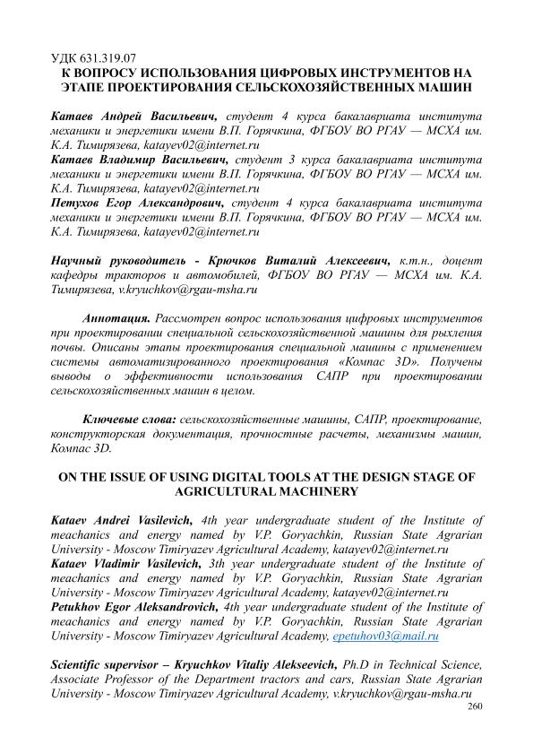 Катаев, Андрей Васильевич. К ВОПРОСУ ИСПОЛЬЗОВАНИЯ ЦИФРОВЫХ ИНСТРУМЕНТОВ НА ЭТАПЕ ПРОЕКТИРОВАНИЯ СЕЛЬСКОХОЗЯЙСТВЕННЫХ МАШИН = ON THE ISSUE OF USING DIGITAL TOOLS AT THE DESIGN STAGE OF AGRICULTURAL MACHINERY: СЕКЦИЯ «ЦИФРОВЫЕ ТЕХНОЛОГИИ В АГРОИНЖЕНЕРИИ» / А. В. Катаев , В. В. Катаев , Е. А. Петухов; науч.рук. В. А. Крючков. — с.260-264. — Электрон. текстовые дан. // СБОРНИК СТАТЕЙ по материалам Научного форума: Экономика, управление и цифровые технологии в АПК-2024. Том 4. – 2024. – Коллекция: Конференции РГАУ - МСХА им. К. А. Тимирязева. — Свободный доступ из сети Интернет (чтение, печать, копирование). — Режим доступа : http://elib.timacad.ru/dl/full/sb170325-t1-4-56.pdf. - Загл. с титул. экрана. — <URL:http://elib.timacad.ru/dl/full/sb170325-t1-4-56.pdf>.