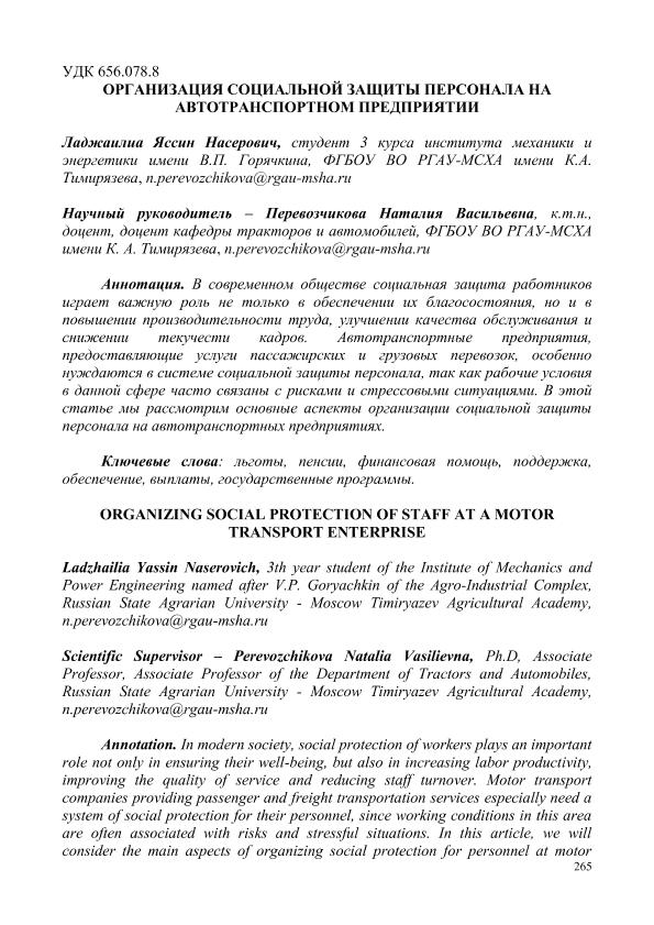 Ладжаилиа, Яссин Насерович. ОРГАНИЗАЦИЯ СОЦИАЛЬНОЙ ЗАЩИТЫ ПЕРСОНАЛА НА АВТОТРАНСПОРТНОМ ПРЕДПРИЯТИИ = ORGANIZING SOCIAL PROTECTION OF STAFF AT A MOTOR TRANSPORT ENTERPRISE: СЕКЦИЯ «ЦИФРОВЫЕ ТЕХНОЛОГИИ В АГРОИНЖЕНЕРИИ» / Я. Н. Ладжаилиа; науч.рук. Н. В. ПЕРЕВОЗЧИКОВА. — с.265-269. — Электрон. текстовые дан. // СБОРНИК СТАТЕЙ по материалам Научного форума: Экономика, управление и цифровые технологии в АПК-2024. Том 4. – 2024. – Коллекция: Конференции РГАУ - МСХА им. К. А. Тимирязева. — Свободный доступ из сети Интернет (чтение, печать, копирование). — Режим доступа : http://elib.timacad.ru/dl/full/sb170325-t1-4-57.pdf. - Загл. с титул. экрана. — <URL:http://elib.timacad.ru/dl/full/sb170325-t1-4-57.pdf>.