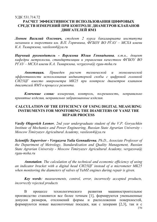 Леонов, Василий Олегович. РАСЧЕТ ЭФФЕКТИВНОСТИ ИСПОЛЬЗОВАНИЯ ЦИФРОВЫХ СРЕДСТВ ИЗМЕРЕНИЙ ПРИ КОНТРОЛЕ ДИАМЕТРОВ КЛАПАНОВ ДВИГАТЕЛЕЙ ЯМЗ = CALCULATION OF THE EFFICIENCY OF USING DIGITAL MEASURING INSTRUMENTS FOR MONITORING THE DIAMETERS OF YАMZ THE REPAIR PROCESS: СЕКЦИЯ «ЦИФРОВЫЕ ТЕХНОЛОГИИ В АГРОИНЖЕНЕРИИ» / В. О. Леонов; науч.рук. Ю. Г. Вергазова. — с.270-274. — Электрон. текстовые дан. // СБОРНИК СТАТЕЙ по материалам Научного форума: Экономика, управление и цифровые технологии в АПК-2024. Том 4. – 2024. – Коллекция: Конференции РГАУ - МСХА им. К. А. Тимирязева. — Свободный доступ из сети Интернет (чтение, печать, копирование). — Режим доступа : http://elib.timacad.ru/dl/full/sb170325-t1-4-58.pdf. - Загл. с титул. экрана. — <URL:http://elib.timacad.ru/dl/full/sb170325-t1-4-58.pdf>.