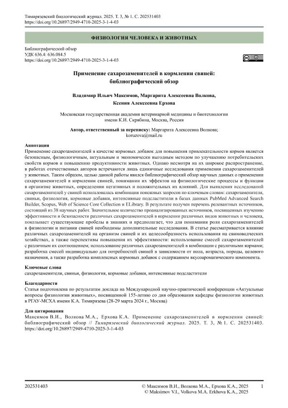 Максимов, Владимир Ильич. Применение сахарозаменителей в кормлении свиней: библиографический обзор = Application of sweeteners in pig feeding: a bibliographic review / В. И. Максимов, М. А. Волкова, К. А. Ерхова. — c.202531403 // ТИМИРЯЗЕВСКИЙ БИОЛОГИЧЕСКИЙ ЖУРНАЛ / TIMIRYAZEV BIOLOGICAL JOURNAL. – 2025. – Т.3. — Коллекция: Тимирязевский биологический журнал. — Доступ по паролю из сети Интернет (чтение, печать, копирование). — <URL:http://elib.timacad.ru/dl/full/tbg-09-2025-1.pdf>.