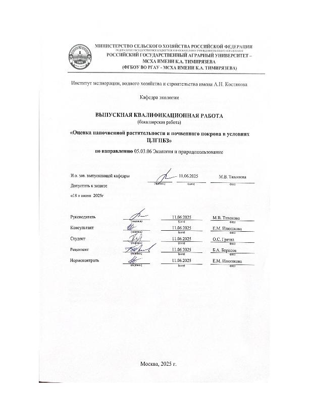 Гречка, Ольга Сергеевна. Оценка напочвенной растительности и почвенного покрова в условиях ЦЛГПБЗ: : защищена ..2025 / О. С. Гречка; рук. работы М. В. Тихонова; конс. работы Е. М. Илюшкова; Российский государственный аграрный университет - МСХА имени К. А. Тимирязева [и др.]. — Электрон. текстовые дан. — Москва, 2025. — 78 с. — Коллекция: Выпускные квалификационные работы. — Доступ по паролю из сети Интернет (чтение, печать, копирование). — Режим доступа : http://elib.timacad.ru/dl/local/vkr-k13055.pdf. - Загл. с титул. экрана. - Электрон. версия печ. публикации. — <URL:http://elib.timacad.ru/dl/local/vkr-k13055.pdf>.