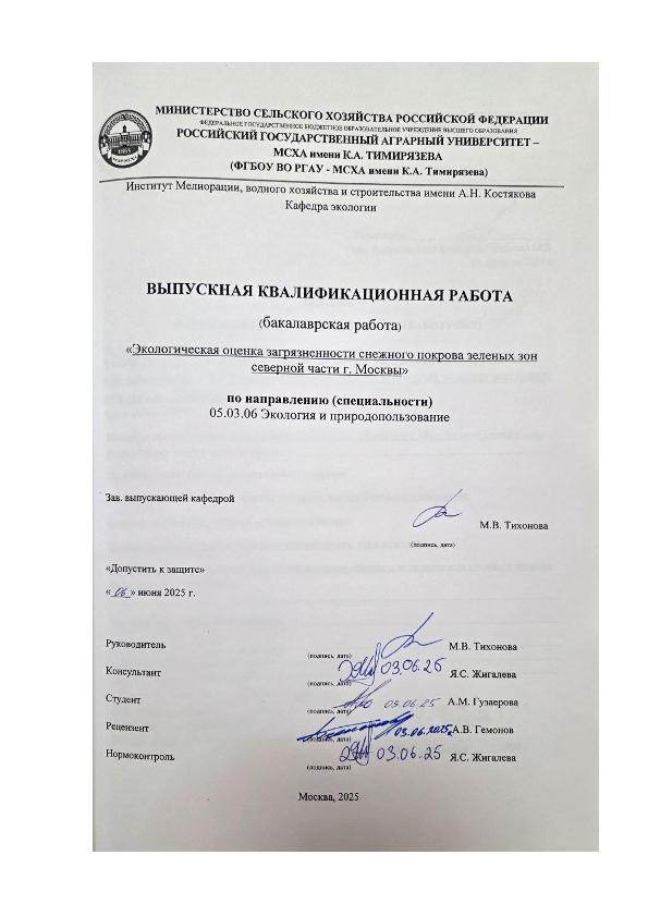 Гузаерова, Алия Маратовна. Экологическая оценка загрязненности снежного покрова зеленых зон северной части г. Москвы: : защищена ..2025 / А. М. Гузаерова; рук. работы М. В. Тихонова; конс. работы Я. С. Жигалева; Российский государственный аграрный университет - МСХА имени К. А. Тимирязева [и др.]. — Электрон. текстовые дан. — Москва, 2025. — 54 с. — Коллекция: Выпускные квалификационные работы. — Доступ по паролю из сети Интернет (чтение, печать, копирование). — Режим доступа : http://elib.timacad.ru/dl/local/vkr-k13057.pdf. - Загл. с титул. экрана. - Электрон. версия печ. публикации. — <URL:http://elib.timacad.ru/dl/local/vkr-k13057.pdf>.