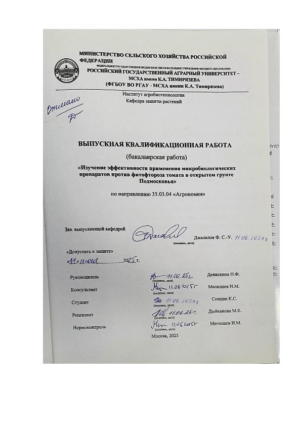 Спицин, К. С. Изучение эффективности применения микробиологических препаратов против фитофтороза томата в открытом грунте Подмосковья: защищена ..2025 / К. С. Спицин; рук. работы Н. Ф. Денискина; Российский государственный аграрный университет - МСХА имени К. А. Тимирязева [и др.]. — Электрон. текстовые дан. — Москва, 2025. — 77 с. — Коллекция: Выпускные квалификационные работы. — Доступ по паролю из сети Интернет (чтение, печать, копирование). — Режим доступа : http://elib.timacad.ru/dl/local/vkr-k12039.pdf. - Загл. с титул. экрана. - Электрон. версия печ. публикации. — <URL:http://elib.timacad.ru/dl/local/vkr-k12039.pdf>.