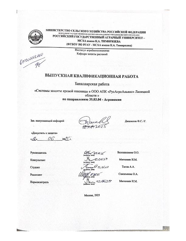Титов, А. А. Системы защиты яровой пшеницы в ООО АПК "РусАгроАльянс" Липецкой области: защищена ..2025 / А. А. Титов; рук. работы О. О. Белошапкина; Российский государственный аграрный университет - МСХА имени К. А. Тимирязева [и др.]. — Электрон. текстовые дан. — Москва, 2025. — 66 с. — Коллекция: Выпускные квалификационные работы. — Доступ по паролю из сети Интернет (чтение, печать, копирование). — Режим доступа : http://elib.timacad.ru/dl/local/vkr-k12041.pdf. - Загл. с титул. экрана. - Электрон. версия печ. публикации. — <URL:http://elib.timacad.ru/dl/local/vkr-k12041.pdf>.