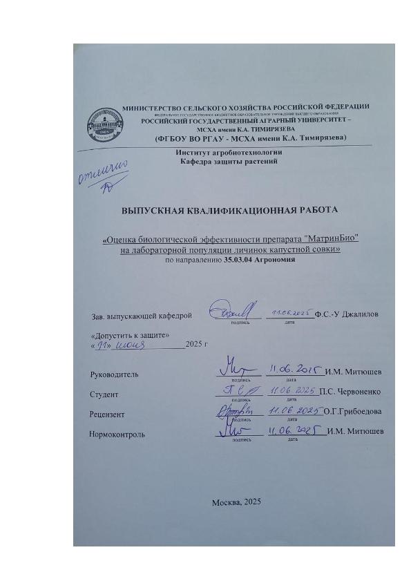 Червоненко, П. С. Оценка биологической эффективности препарата "МатринБио", ВР на лабораторной популяции личинок капустной совки: защищена ..2025 / П. С. Червоненко; рук. работы И. М. Митюшев; Российский государственный аграрный университет - МСХА имени К. А. Тимирязева [и др.]. — Электрон. текстовые дан. — Москва, 2025. — 48 с. — Коллекция: Выпускные квалификационные работы. — Доступ по паролю из сети Интернет (чтение, печать, копирование). — Режим доступа : http://elib.timacad.ru/dl/local/vkr-k12042.pdf. - Загл. с титул. экрана. - Электрон. версия печ. публикации. — <URL:http://elib.timacad.ru/dl/local/vkr-k12042.pdf>.