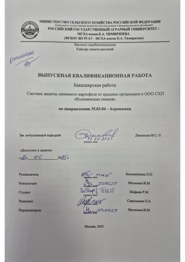 Шафиев, Р. М. Система защиты семенного картофеля от вредных организмов в ООО СХП "Коломенские семена": защищена ..2025 / Р. М. Шафиев; рук. работы О. О. Белошапкина; Российский государственный аграрный университет - МСХА имени К. А. Тимирязева [и др.]. — Электрон. текстовые дан. — Москва, 2025. — 51 с. — Коллекция: Выпускные квалификационные работы. — Доступ по паролю из сети Интернет (чтение, печать, копирование). — Режим доступа : http://elib.timacad.ru/dl/local/vkr-k12043.pdf. - Загл. с титул. экрана. - Электрон. версия печ. публикации. — <URL:http://elib.timacad.ru/dl/local/vkr-k12043.pdf>.