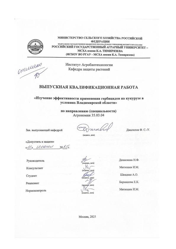 Швидкая, А. О. Изучение эффективности применения гербицидов на кукурузе в условиях Владимирской области: защищена ..2025 / А. О. Швидкая; рук. работы Н. Ф. Денискина; Российский государственный аграрный университет - МСХА имени К. А. Тимирязева [и др.]. — Электрон. текстовые дан. — Москва, 2025. — 63 с. — Коллекция: Выпускные квалификационные работы. — Доступ по паролю из сети Интернет (чтение, печать, копирование). — Режим доступа : http://elib.timacad.ru/dl/local/vkr-k12044.pdf. - Загл. с титул. экрана. - Электрон. версия печ. публикации. — <URL:http://elib.timacad.ru/dl/local/vkr-k12044.pdf>.