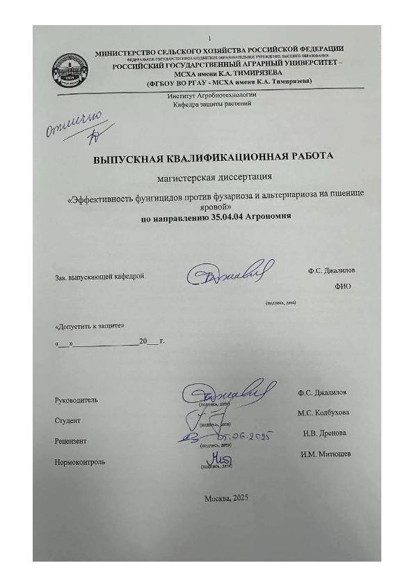 Колбухова, М. С. Эффективность фунгицидов против фузариоза и альтернариоза на пшенице яровой: защищена ..2025 / М. С. Колбухова; рук. работы Ф. С. Джалилов; Российский государственный аграрный университет - МСХА имени К. А. Тимирязева [и др.]. — Электрон. текстовые дан. — Москва, 2025. — 82 с. — Коллекция: Выпускные квалификационные работы. — Доступ по паролю из сети Интернет (чтение, печать, копирование). — Режим доступа : http://elib.timacad.ru/dl/local/vkr-k12048.pdf. - Загл. с титул. экрана. - Электрон. версия печ. публикации. — <URL:http://elib.timacad.ru/dl/local/vkr-k12048.pdf>.
