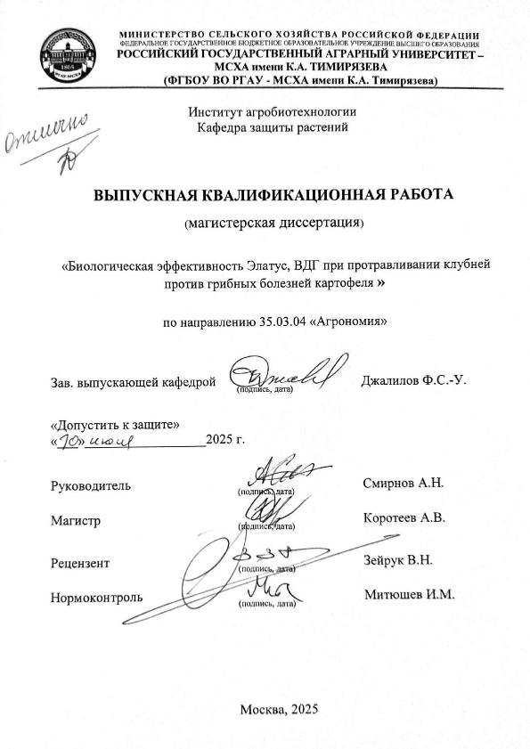 Коротеев, А. В. Биологическая эффекттивность Элатус, ВДГ при протравливании клубней против грибных болезней картофеля: защищена ..2025 / А. В. Коротеев; рук. работы А. Н. Смирнов; Российский государственный аграрный университет - МСХА имени К. А. Тимирязева [и др.]. — Электрон. текстовые дан. — Москва, 2025. — 86 с. — Коллекция: Выпускные квалификационные работы. — Доступ по паролю из сети Интернет (чтение, печать, копирование). — Режим доступа : http://elib.timacad.ru/dl/local/vkr-k12049.pdf. - Загл. с титул. экрана. - Электрон. версия печ. публикации. — <URL:http://elib.timacad.ru/dl/local/vkr-k12049.pdf>.