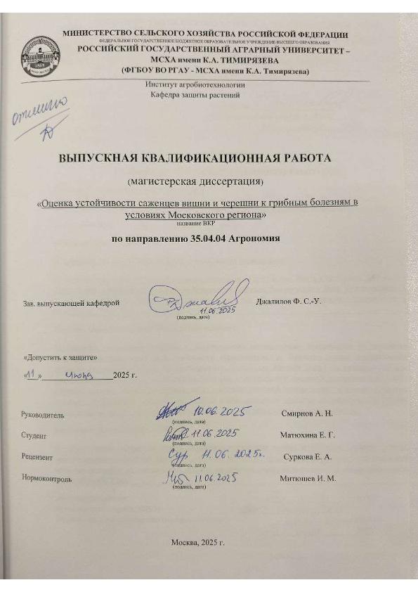 Матюхина, Е. Г. Оценка устойчивости саженцев вишни и черешни к грибным болезням в условиях Московского региона: защищена ..2025 / Е. Г. Матюхина; рук. работы А. Н. Смирнов; Российский государственный аграрный университет - МСХА имени К. А. Тимирязева [и др.]. — Электрон. текстовые дан. — Москва, 2025. — 101 с. — Коллекция: Выпускные квалификационные работы. — Доступ по паролю из сети Интернет (чтение, печать, копирование). — Режим доступа : http://elib.timacad.ru/dl/local/vkr-k12050.pdf. - Загл. с титул. экрана. - Электрон. версия печ. публикации. — <URL:http://elib.timacad.ru/dl/local/vkr-k12050.pdf>.