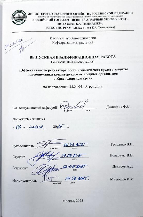 Новарчук, В. В. Эффективность регулятора роста и химических средств защиты подсолнечника кондитерского от вредных организмов в Краснодарском крае: защищена ..2025 / В. В. Новарчук; рук. работы В. В. Гриценко; Российский государственный аграрный университет - МСХА имени К. А. Тимирязева [и др.]. — Электрон. текстовые дан. — Москва, 2025. — 77 с. — Коллекция: Выпускные квалификационные работы. — Доступ по паролю из сети Интернет (чтение, печать, копирование). — Режим доступа : http://elib.timacad.ru/dl/local/vkr-k12051.pdf. - Загл. с титул. экрана. - Электрон. версия печ. публикации. — <URL:http://elib.timacad.ru/dl/local/vkr-k12051.pdf>.
