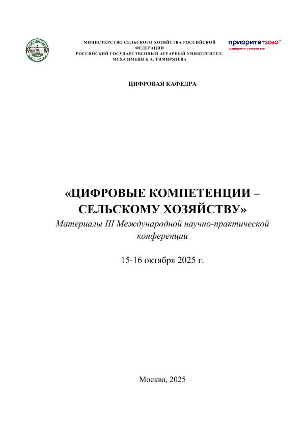 Цифровые компетенции – сельскому хозяйству: материалы III Международной научно-практической конференции 15-16 октября 2025 г. / РГАУ-МСХА имени К.А. Тимирязева. — Электрон. текстовые дан. — Москва, 15-16 октября 2025г, 2025. — 202 с. — Коллекция: Конференции РГАУ - МСХА им. К. А. Тимирязева. — Свободный доступ из сети Интернет (чтение, печать, копирование). — Режим доступа : http://elib.timacad.ru/dl/full/s1202Digital_competencies.pdf. - Загл. с титул. экрана. - Электрон. версия печ. публикации. — <URL:http://elib.timacad.ru/dl/full/s1202Digital_competencies.pdf>.