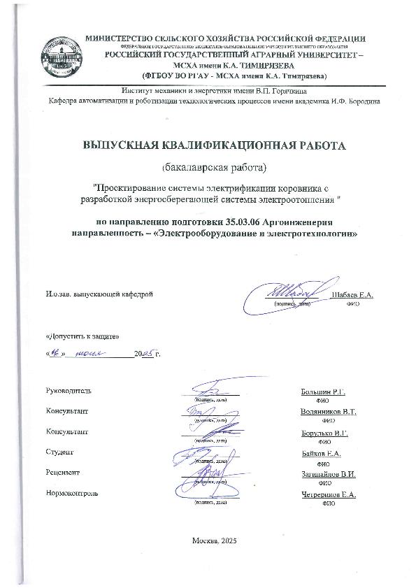 Байков, Е. А. Проектирование системы электрификации коровника с разработкой энергосберегающей системы электроотопления: защищена ..2025 / Е. А. Байков; рук. работы Р. Г. Большин; Российский государственный аграрный университет - МСХА имени К. А. Тимирязева [и др.]. — Электрон. текстовые дан. — Москва, 2025. — 102 с. — Коллекция: Выпускные квалификационные работы. — Доступ по паролю из сети Интернет (чтение, печать, копирование). — Режим доступа : http://elib.timacad.ru/dl/local/vkr-k12721.pdf. - Загл. с титул. экрана. - Электрон. версия печ. публикации. — <URL:http://elib.timacad.ru/dl/local/vkr-k12721.pdf>.