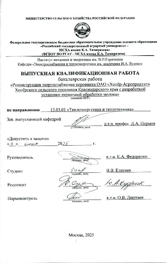 Елисеев, В. В. Реконструкция энергоснабжения коровника ОАО «Хопёр - Агропродукт»Хопёрского сельского поселения Краснодарского края с разработкой установки первичной обработки молока: защищена ..2025 / В. В. Елисеев; рук. работы Е. А. Федоренко; Российский государственный аграрный университет - МСХА имени К. А. Тимирязева [и др.]. — Электрон. текстовые дан. — Москва, 2025. — 74 с. — Коллекция: Выпускные квалификационные работы. — Доступ по паролю из сети Интернет (чтение, печать, копирование). — Режим доступа : http://elib.timacad.ru/dl/local/vkr-k12632.pdf. - Загл. с титул. экрана. - Электрон. версия печ. публикации. — <URL:http://elib.timacad.ru/dl/local/vkr-k12632.pdf>.