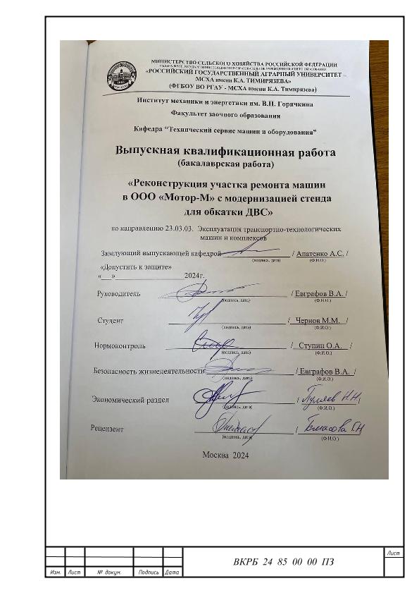 Чернов, Михаил Михайлович. Реконструкция учатска ремонта машин в ООО "Мотор-М" с модернизацией стенда для обкатки ДВС: : защищена ..2024 / М. М. Чернов; рук. работы В. А. Евграфов; Российский государственный аграрный университет - МСХА имени К. А. Тимирязева [и др.]. — Электрон. текстовые дан. — Москва, 2024. — 86 с. — Коллекция: Выпускные квалификационные работы. — Доступ по паролю из сети Интернет (чтение, печать, копирование). — Режим доступа : http://elib.timacad.ru/dl/local/vkr-k12916.pdf. - Загл. с титул. экрана. - Электрон. версия печ. публикации. — <URL:http://elib.timacad.ru/dl/local/vkr-k12916.pdf>.