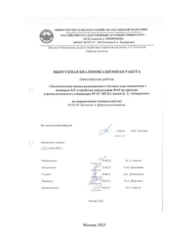 Домашенков, Денис Александрович. Экологическая оценка радиационного баланса агроэкосистемы с помощью IoT устройства определения ФАР на примере агроэкологического стационара РГАУ-МСХА имени К. А. Тимирязева: : защищена ..2025 / Д. А. Домашенков; рук. работы И. А. Серегин; конс. работы А. М. Ярославцев; Российский государственный аграрный университет - МСХА имени К. А. Тимирязева [и др.]. — Электрон. текстовые дан. — Москва, 2025. — 48 с. — Коллекция: Выпускные квалификационные работы. — Доступ по паролю из сети Интернет (чтение, печать, копирование). — Режим доступа : http://elib.timacad.ru/dl/local/vkr-k13060.pdf. - Загл. с титул. экрана. - Электрон. версия печ. публикации. — <URL:http://elib.timacad.ru/dl/local/vkr-k13060.pdf>.