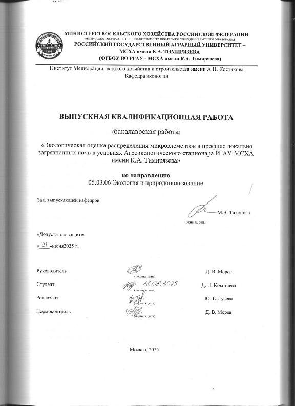 Кокотаева, Дария Павловна. Экологическая оценка распределения микроэлементов в профиле локально загрязненных почв в условиях Агроэкологического стационара РГАУ-МСХА имени К. А. Тимирязева: : защищена ..2025 / Д. П. Кокотаева; рук. работы Д. В. Морев; Российский государственный аграрный университет - МСХА имени К. А. Тимирязева [и др.]. — Электрон. текстовые дан. — Москва, 2025. — 61 с. — Коллекция: Выпускные квалификационные работы. — Доступ по паролю из сети Интернет (чтение, печать, копирование). — Режим доступа : http://elib.timacad.ru/dl/local/vkr-k13072.pdf. - Загл. с титул. экрана. - Электрон. версия печ. публикации. — <URL:http://elib.timacad.ru/dl/local/vkr-k13072.pdf>.