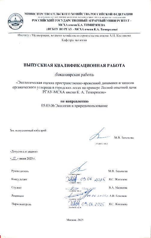 Матвеева, Виктория Алексеевна. Экологическая оценка пространственно-временной динамики и запасов органического углерода в городских лесах на примере Лесной опытной дачи РГАУ-МСХА имени К. А. Тимирязева: : защищена ..2025 / В. А. Матвеева; рук. работы М. В. Тихонова; конс. работы Я. С. Жигалева; Российский государственный аграрный университет - МСХА имени К. А. Тимирязева [и др.]. — Электрон. текстовые дан. — Москва, 2025. — 88 с. — Коллекция: Выпускные квалификационные работы. — Доступ по паролю из сети Интернет (чтение, печать, копирование). — Режим доступа : http://elib.timacad.ru/dl/local/vkr-k13083.pdf. - Загл. с титул. экрана. - Электрон. версия печ. публикации. — <URL:http://elib.timacad.ru/dl/local/vkr-k13083.pdf>.