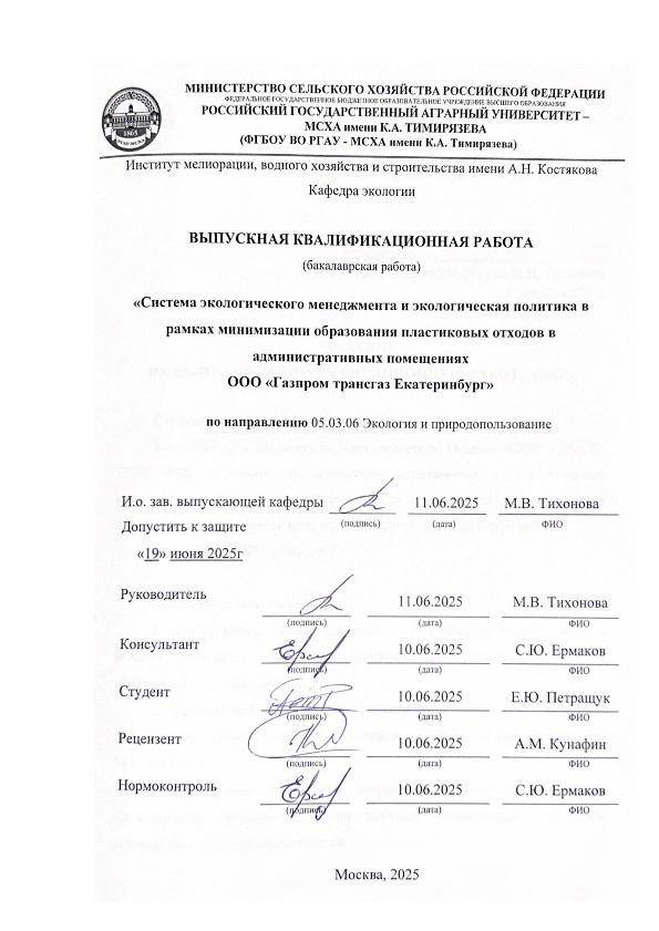 Петращук, Екатерина Юрьевна. Система экологического менеджмента и экологическая политика в рамках минимизации образования пластиковых отходов в административных помещениях ООО "Газпром трансгаз Екатеринбург": : защищена ..2025 / Е. Ю. Петращук; рук. работы М. В. Тихонова; конс. работы С. Ю. Ермаков; Российский государственный аграрный университет - МСХА имени К. А. Тимирязева [и др.]. — Электрон. текстовые дан. — Москва, 2025. — 70 с. — Коллекция: Выпускные квалификационные работы. — Доступ по паролю из сети Интернет (чтение, печать, копирование). — Режим доступа : http://elib.timacad.ru/dl/local/vkr-k13093.pdf. - Загл. с титул. экрана. - Электрон. версия печ. публикации. — <URL:http://elib.timacad.ru/dl/local/vkr-k13093.pdf>.