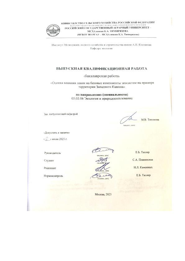 Плавинская, София Алексеевна. Оценка влияния лавин на базовые компоненты экосистем на примере территории Западного Кавказа: : защищена ..2025 / С. Ф. Плавинская; рук. работы Е. Б. Таллер; Российский государственный аграрный университет - МСХА имени К. А. Тимирязева [и др.]. — Электрон. текстовые дан. — Москва, 2025. — 90 с. — Коллекция: Выпускные квалификационные работы. — Доступ по паролю из сети Интернет (чтение, печать, копирование). — Режим доступа : http://elib.timacad.ru/dl/local/vkr-k13096.pdf. - Загл. с титул. экрана. - Электрон. версия печ. публикации. — <URL:http://elib.timacad.ru/dl/local/vkr-k13096.pdf>.