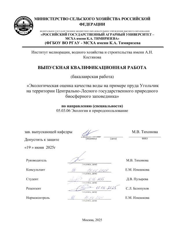 Пузырёва, Дарья Витальевна. Экологическая оценка качества воды на примере пруда Угольчик на территории Центрально-Лесного государственного природного биосферного заповедника: : защищена ..2025 / Д. В. Пузырёва; рук. работы М. В. Тихонова; конс. работы Е. М. Илюшкова; Российский государственный аграрный университет - МСХА имени К. А. Тимирязева [и др.]. — Электрон. текстовые дан. — Москва, 2025. — 63 с. — Коллекция: Выпускные квалификационные работы. — Доступ по паролю из сети Интернет (чтение, печать, копирование). — Режим доступа : http://elib.timacad.ru/dl/local/vkr-k13099.pdf. - Загл. с титул. экрана. - Электрон. версия печ. публикации. — <URL:http://elib.timacad.ru/dl/local/vkr-k13099.pdf>.
