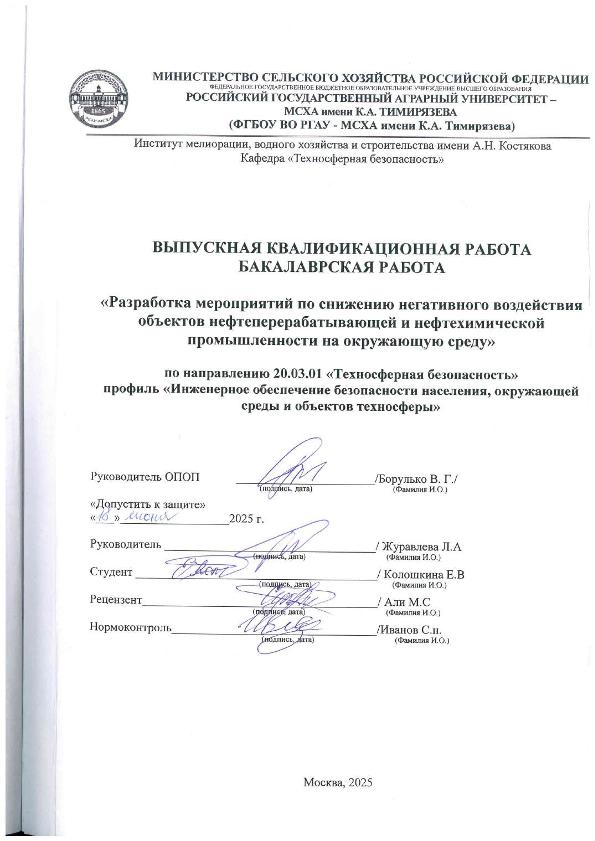 Колошкина, Е. В. Разработка мероприятий по снижению негативного воздействия объектов нефтеперерабатывающей и нефтехимической промышленности на окружающую среду: защищена ..2025 / Е. В. Колошкина; рук. работы Л. А. Журавлева; Российский государственный аграрный университет - МСХА имени К. А. Тимирязева [и др.]. — Электрон. текстовые дан. — Москва, 2025. — 82 с. — Коллекция: Выпускные квалификационные работы. — Доступ по паролю из сети Интернет (чтение, печать, копирование). — Режим доступа : http://elib.timacad.ru/dl/local/vkr-k11997.pdf. - Загл. с титул. экрана. - Электрон. версия печ. публикации. — <URL:http://elib.timacad.ru/dl/local/vkr-k11997.pdf>.