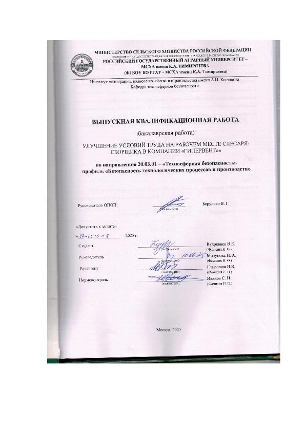 Кудрявцев, В. Е. Улучшение условий труда на рабочем месте слесаря-сборщика в компании «Гипервент»: защищена ..2025 / В. Е. Кудрявцев; рук. работы Н. А. Мочунова; Российский государственный аграрный университет - МСХА имени К. А. Тимирязева [и др.]. — Электрон. текстовые дан. — Москва, 2025. — 72 с. — Коллекция: Выпускные квалификационные работы. — Доступ по паролю из сети Интернет (чтение, печать, копирование). — Режим доступа : http://elib.timacad.ru/dl/local/vkr-k11998.pdf. - Загл. с титул. экрана. - Электрон. версия печ. публикации. — <URL:http://elib.timacad.ru/dl/local/vkr-k11998.pdf>.